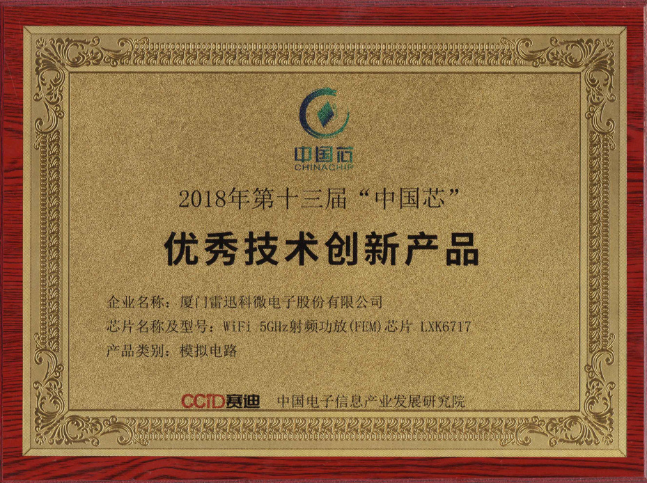 雷迅科公司W(wǎng)IFI 11AC射頻芯片LXK6717獲得2018年第十三屆“中國芯”優(yōu)秀技術(shù)創(chuàng )新產(chǎn)品獎。